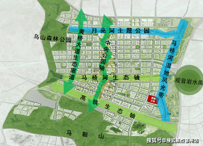 两轴、四廊道生态走廊,“田字形、网络化”的开敞空间体系,超1200公顷生态覆盖率(1.8万亩≈6个梅溪湖湖面面积),公园绿地500米半径全覆盖。