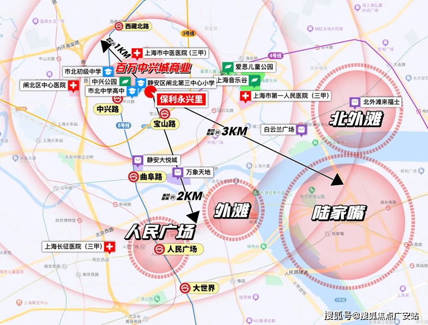 区域配置上,直线公里内涵盖南京西路、人民广场、外滩、外白渡桥等顶级商圈与地标,尽享城市繁华。周边交通便捷,距8号线号线米,三轨环绕,通勤极为便利。1公里内汇聚华润苏河湾中心、中粮大悦中心、万象天地等高端商业,同时坐拥约17.5万㎡城市公园绿地(规划中)、苏河湾公园体系、中兴公园等生态资源,居住环境舒适宜居。医疗资源丰富,3公里内有上海市中医医院、上海长征医院、上海市第一人民医院、上海第十人民医院等多家三甲医院,全方位满足生活需求。