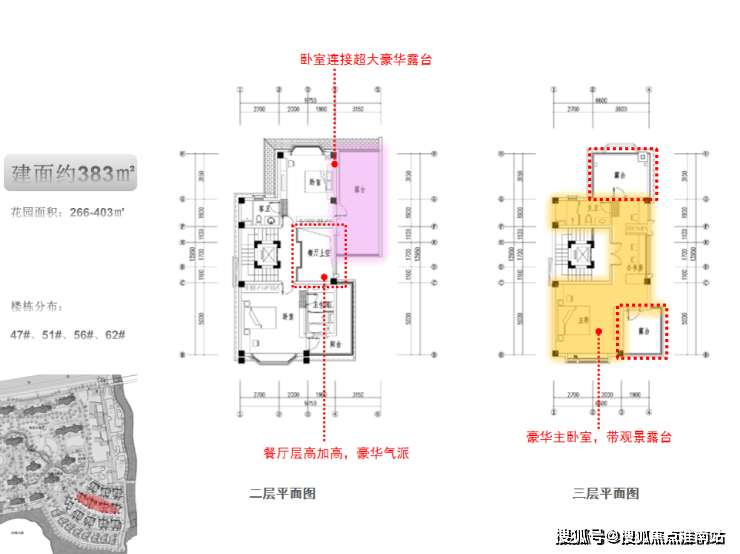 除了一层客厅挑空,赠送额外利用空间外,二层也带客厅,双套房设计,三层豪华主卧,带观景露台,还带一个北套房。
