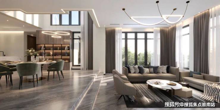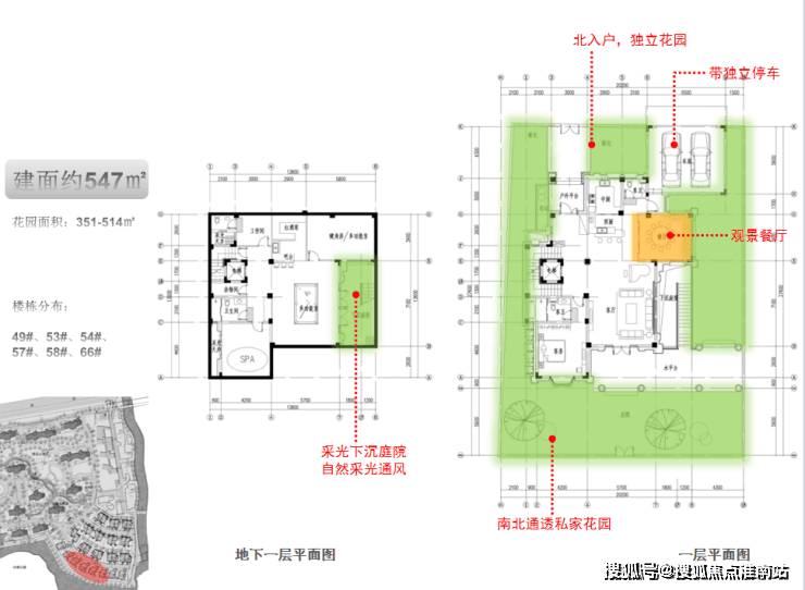 花园面积更大,最小也有351㎡,南北通透私家花园+北入户独立花园+独立双车位,一层客厅开间约5.7米,尤其是观景餐厅,直接可以欣赏到庭院景色。