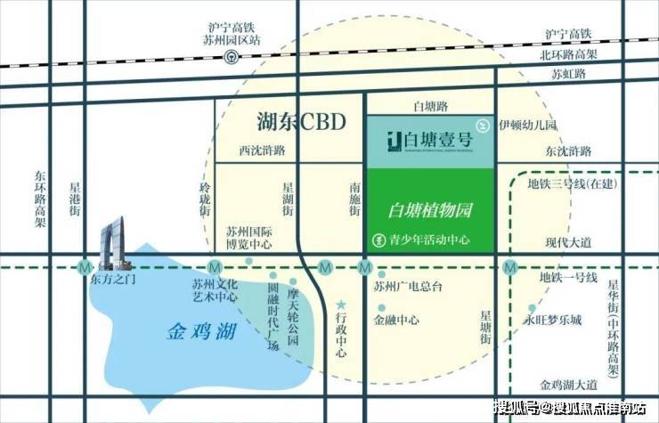 以现代大道为轴线的园区湖东,集聚了金鸡湖景区、时代广场、诚品书店、中环广场(在建)、科文中心、ICC、国金中心、白塘公园、现代传媒广场、东沙湖公园、奥体中心、九龙医院、儿童医院等资源配套,以其无可争议的先进规划和得天独厚的自然环境,成为苏州乃至长三角宜居区域。