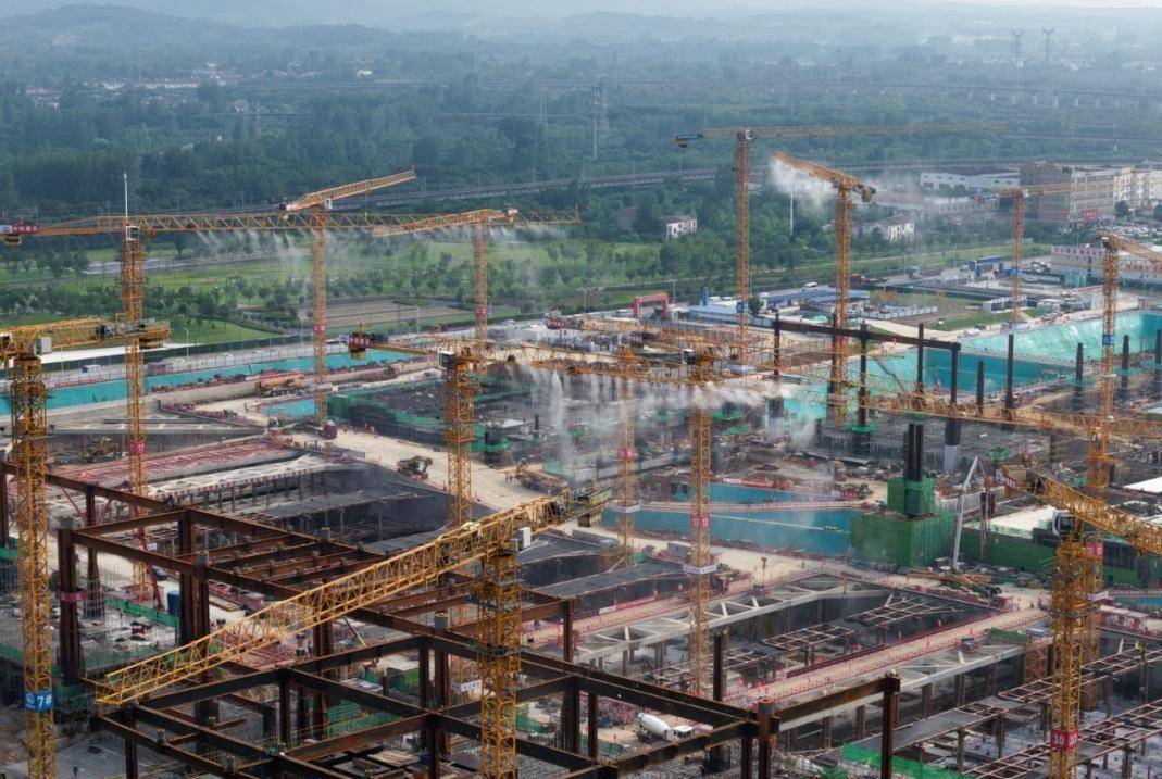 往上看,出站层结构完成了60%,承轨层做了40%,最上面的高架候车层也完成了20%。 5.8万吨的钢结构已经吊装到位,占总量的一半。 这一切,都在为2027年10月的开通目标全力冲刺。