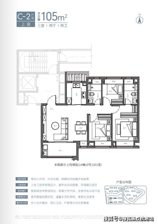 U型厨房、餐厅、客厅、阳台一线联通,南北通透。主卧套房、全卧飘窗、次卫干湿分离也都是标配。